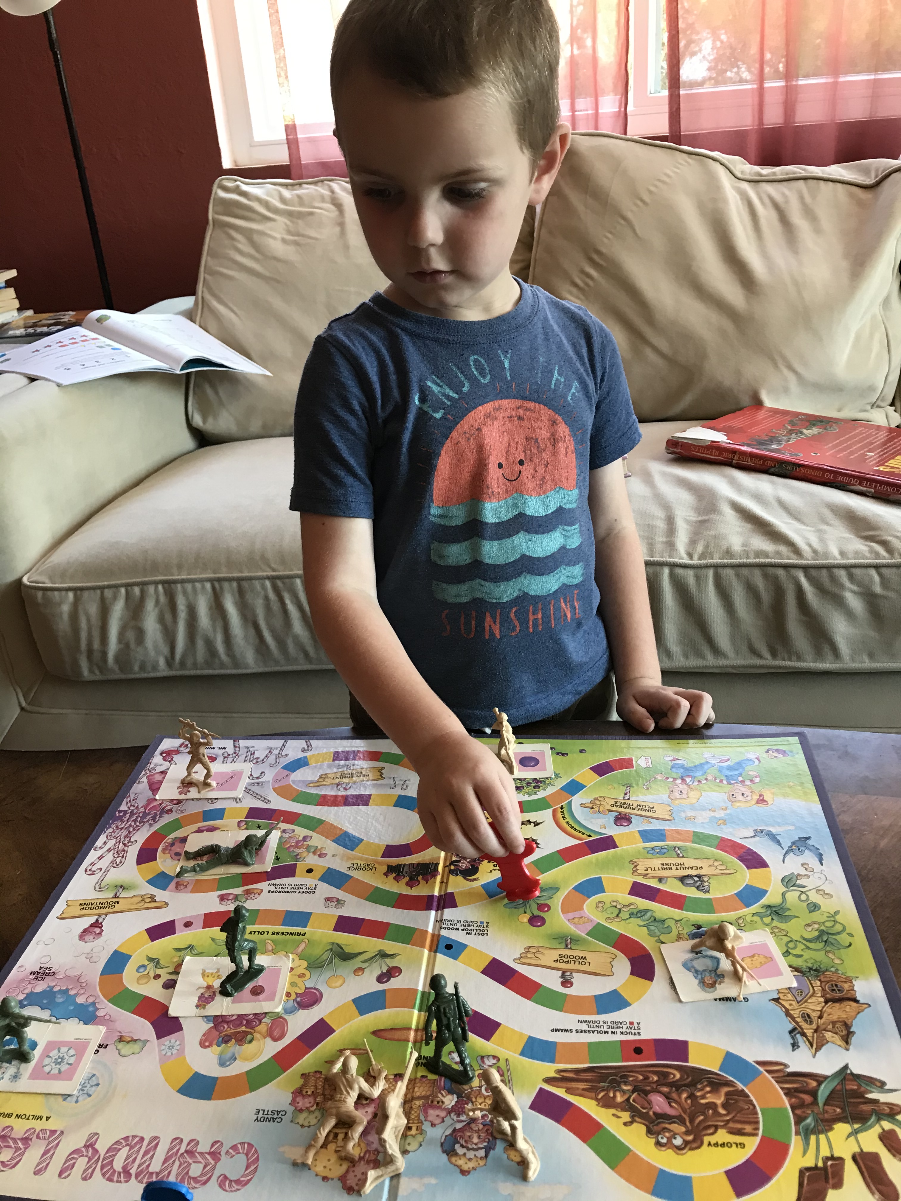And now for something totally unrelated. I posted this picture on Facebook with the words, “Leave it to a boy to turn Candy Land into a military operation.”