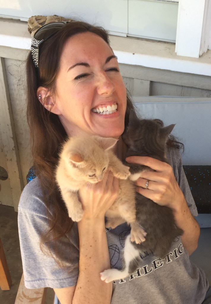 The kitty/puppy pictures are so cute! You are hilarious for interspersing those. I love the puppy but the one of you with the two kitties – your smile is so infectious!