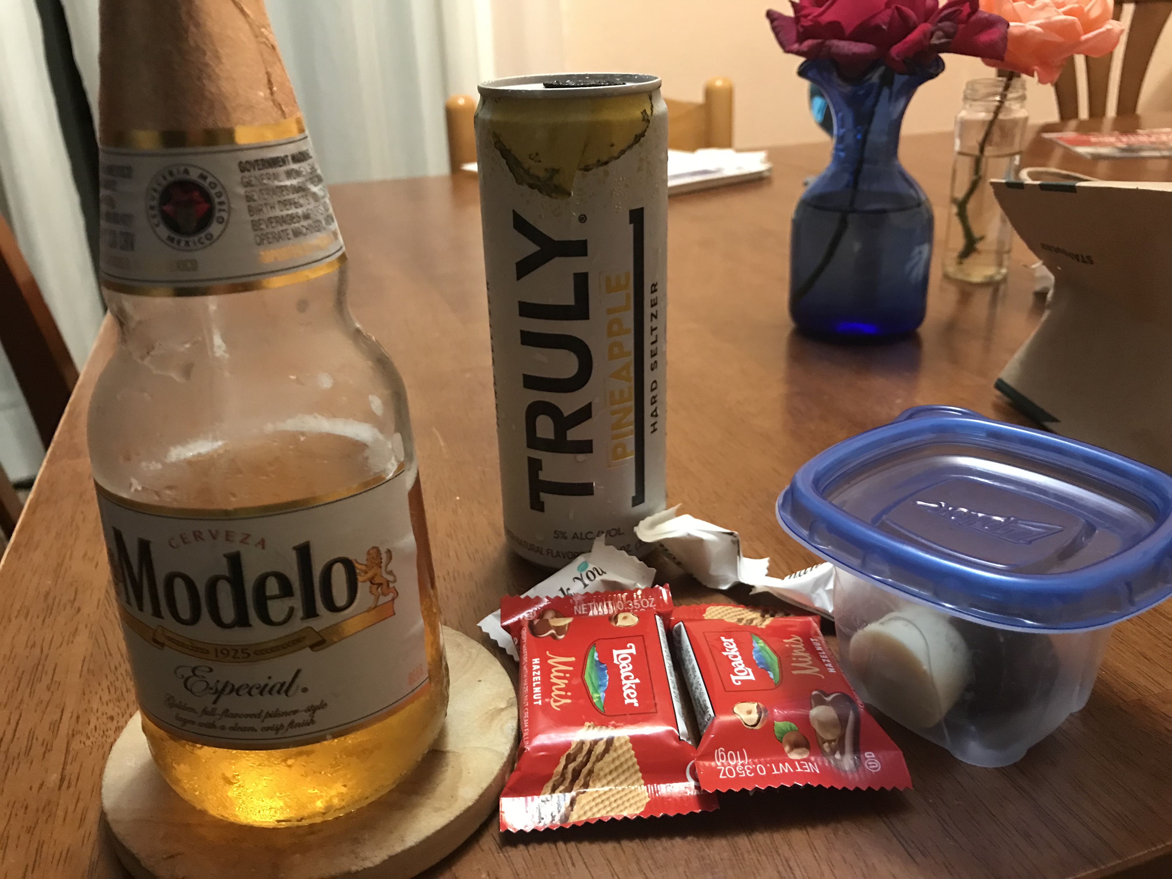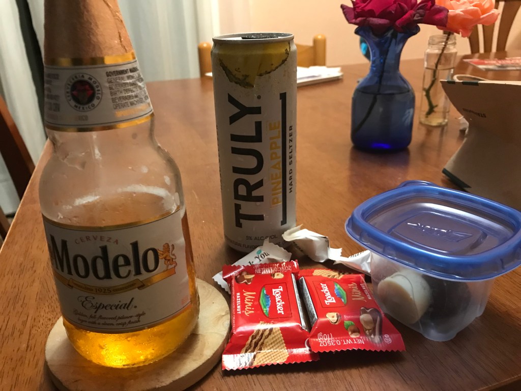 Beer, candy, bonbons in a Tupp-Tupp. The beer did not come mostly drunk. (But I did! Badump-chh!) It was opened immediately upon arrival, however.