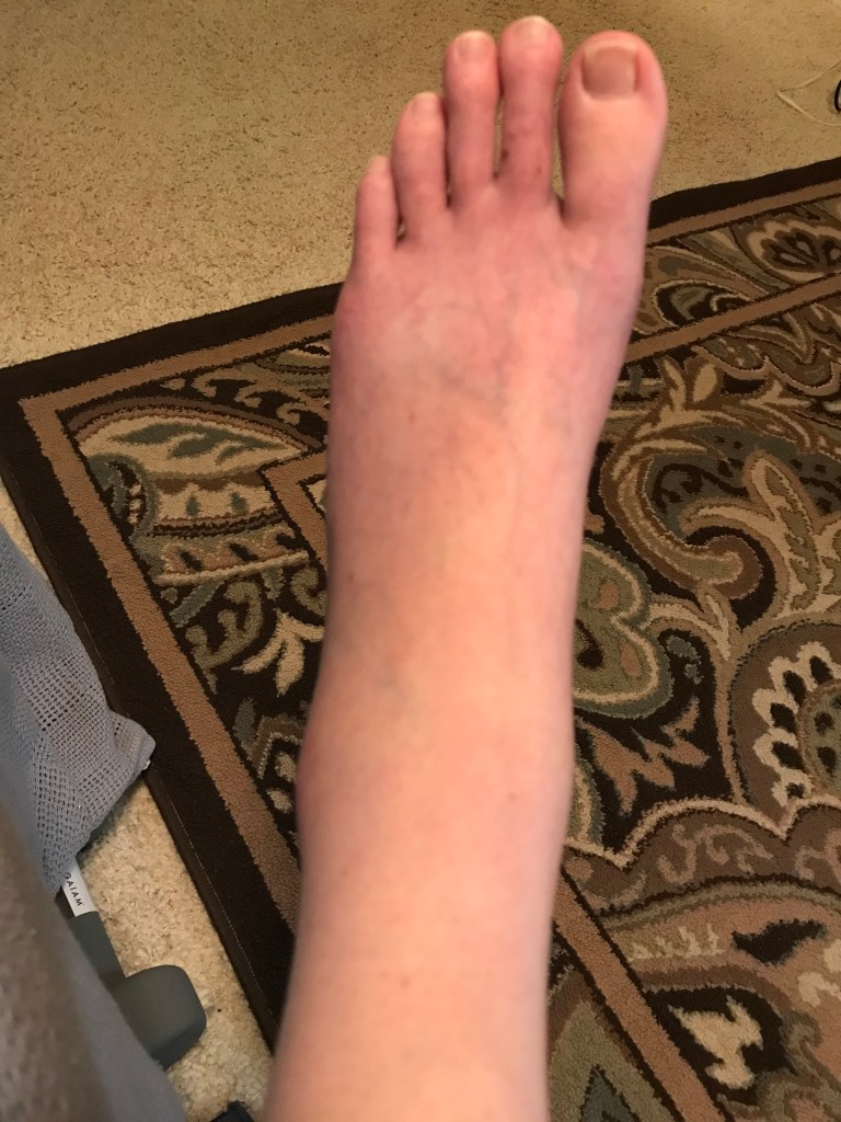 It looks particularly weird since you can’t see the bend at the ankle. In fact, you can’t see the ankle. From there to my toes I’m puffier than normal, and I still can’t fully bend my toes.