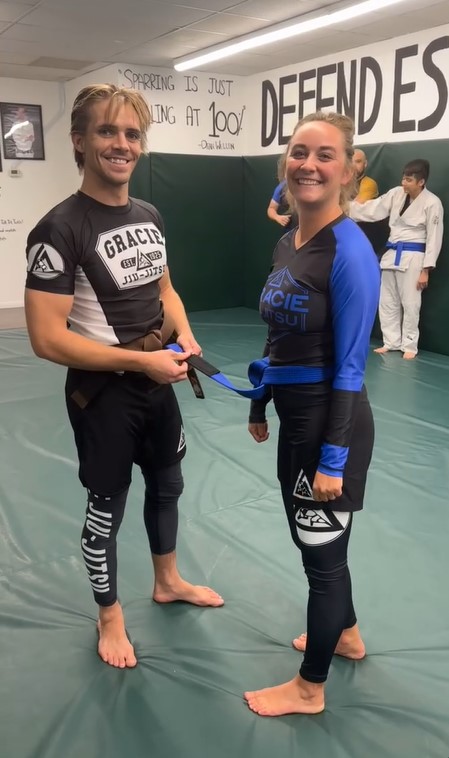 Since I was absent this night, I found out through our Jiu-Jitsu ladies group text that Mrs. Inst. received her first stripe on her blue belt. I messaged her separately to congratulate her and say, “Why didn’t you tell me?!”