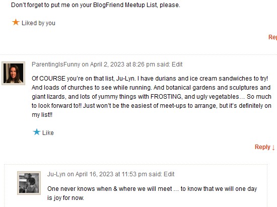 Confirming this was a long time coming, I found the below in my Random File of Death, aka “Photos,” from April 2023. After my post about meeting two blog buddies in Ohio, Ju-Lyn commented: