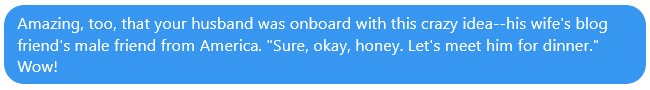 But after their meeting, he told me they were very nice people, easy to get along with, and, “I can see why you like her.”