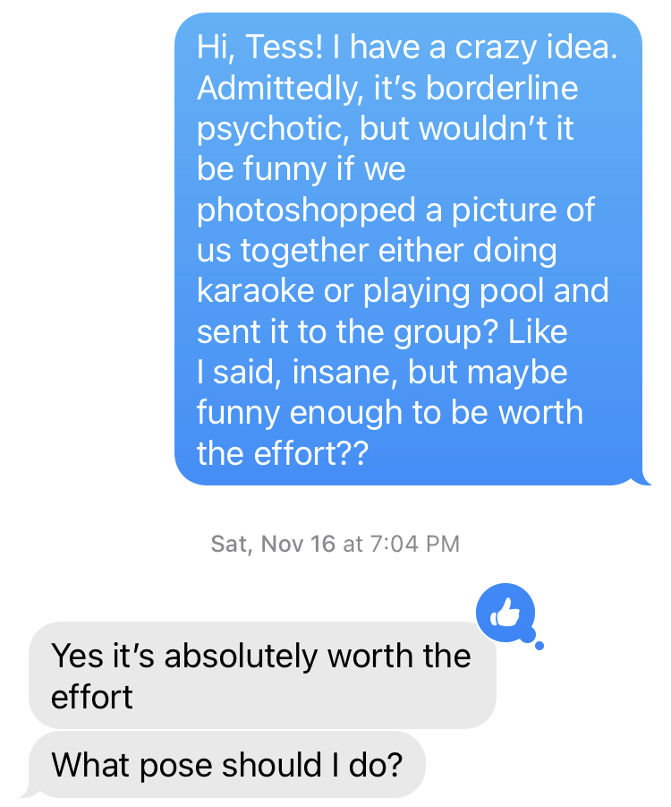 After some back and forth, and the agreement that this would be way funnier coming from her, she sent the group this: