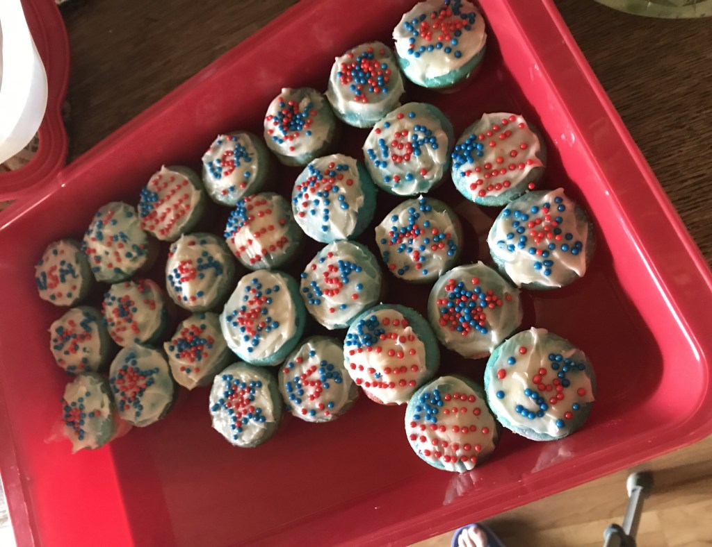 She’s also multi-talented. For July 4th, she made mini cupcakes. Starting with white cake batter, she divided it into three bowls and put red and blue food coloring into each of the two other bowls. So, not only were the cupcakes striped red, white, and blue (and delicious), she used tweezers (washed first!) to painstakingly embellish the frosting with tiny sprinkles.